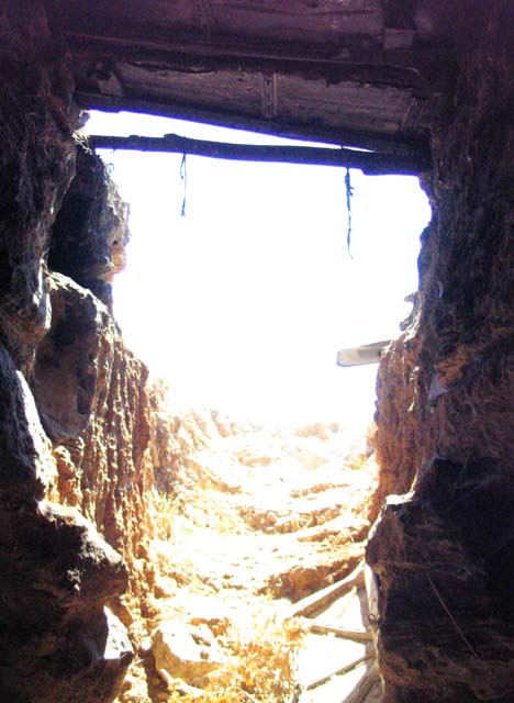 Hajj returns to transferring water from his cistern to a tanker, via a rented-pump and long hose. The hose runs from the cistern and, supported by a ladder, across the forcibly-abandoned cave next to Hajj’s tent. There is a small leak in the hose and water sprays out and down into the cave. Ever aware of limited water, Hajj spends a few minutes balancing a bucket on a large tractor tire more or less below the leak, catching much of the spilled water, to re-use.